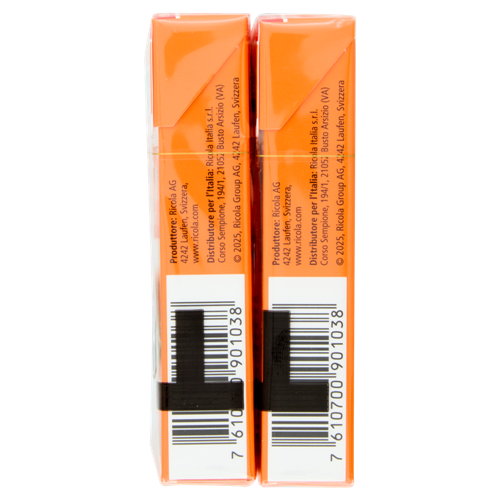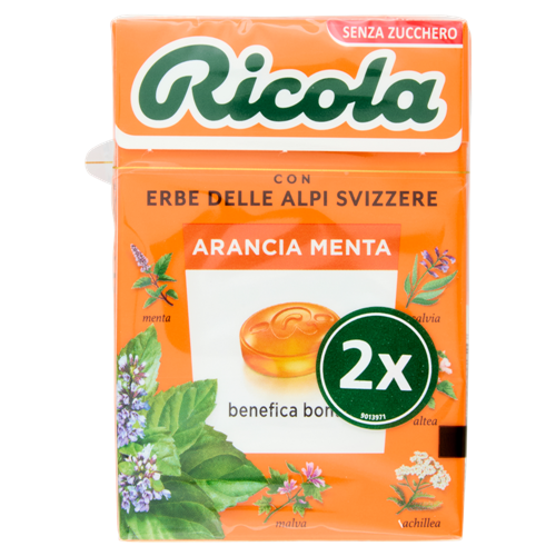 Ricola Arancia Menta senza zucchero combina le 13 erbe originali delle Alpi svizzere con l'estratto di menta arancio per un gusto fresco, leggero e fruttato.
