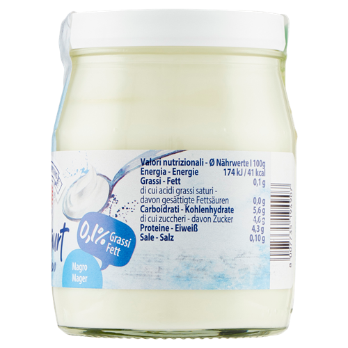 Yogurt magro (latte* scremato pastorizzato, fermenti lattici vivi: Streptococcus thermophilus e Lactobacillus bulgaricus)