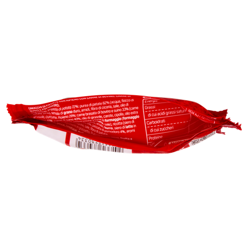 Ripieno 28%: carne brasata di bovino e suino 33% (carne di bovino 40%, carne di suino 40%, olio di girasole, carote, cipolla, olio extra vergine di oliva, rosmarino), preparazione a base di formaggio (formaggio cheddar, acqua, olio di girasole, proteine del latte, sale), ricotta (siero di latte, latte, sale), formaggio grattugiato, amido, burro, siero di latte in polvere, concentrato di pomodoro 4%, passata di pomodoro 4%, aromi naturali, fiocco di patate, cipolla, sale, fibra di patata